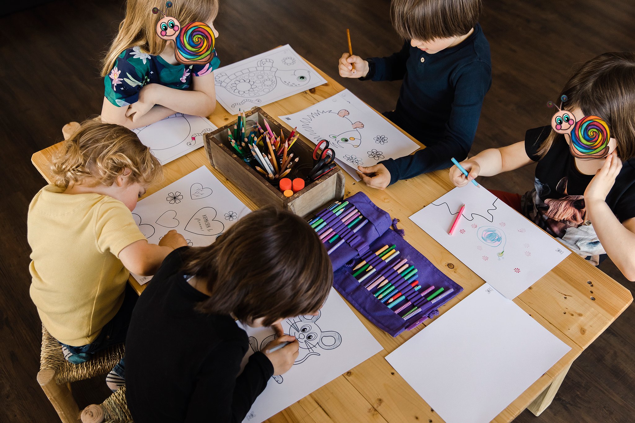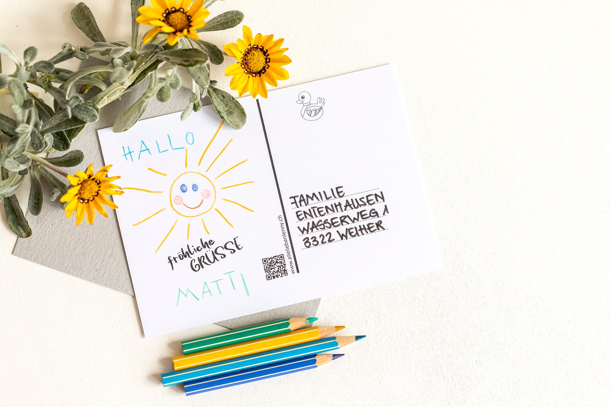 Fröhliche Dinge für kreative Kids; ausmalen, stempeln, Geschichten lesen oder erzählen lassen, zeichnen, basteln und die Grusskarte versenden – das Kind darf selbst aktiv