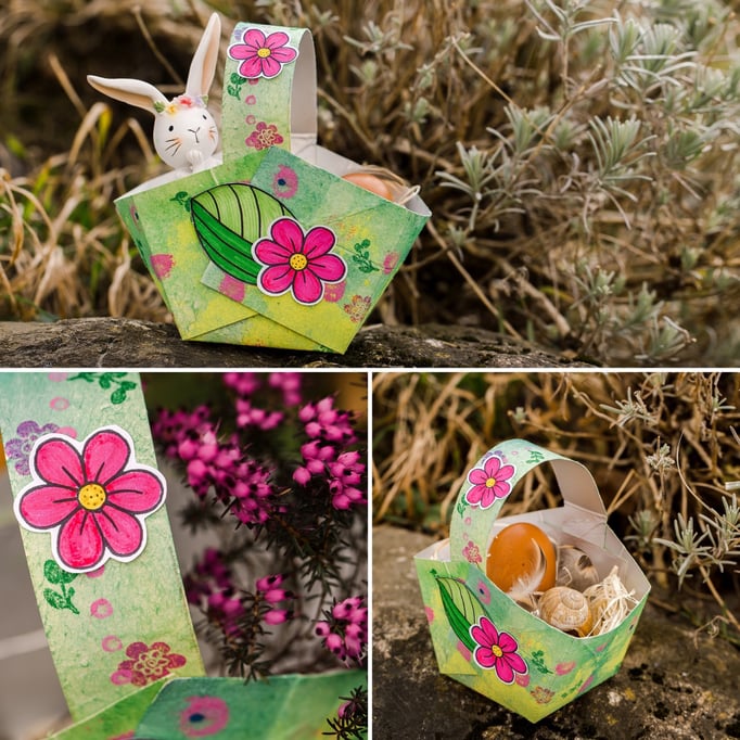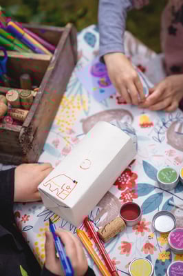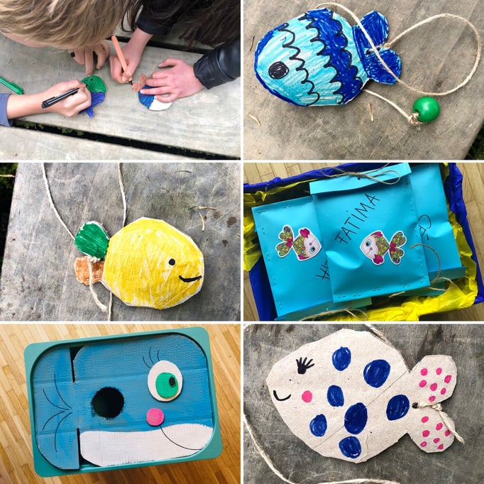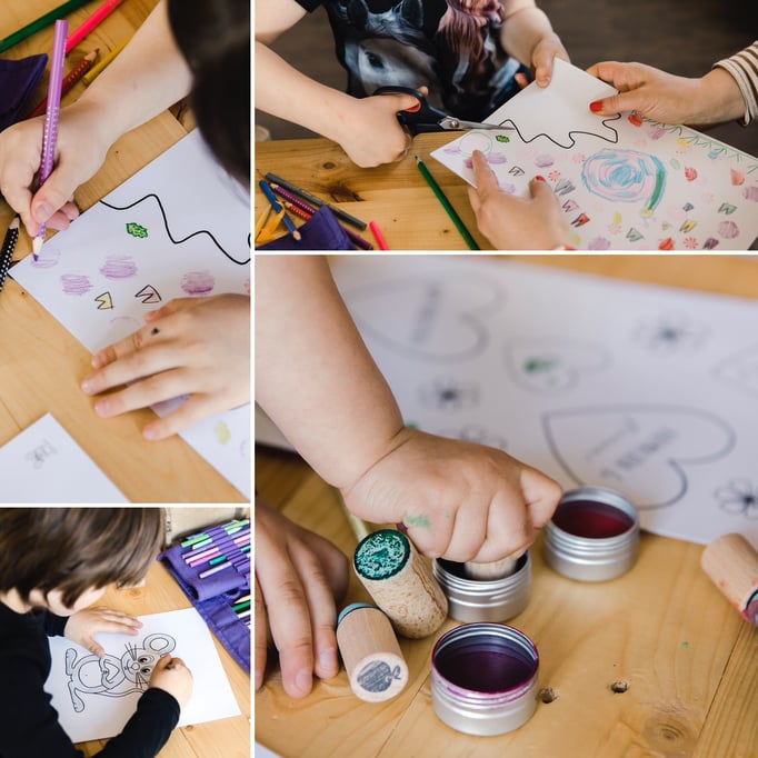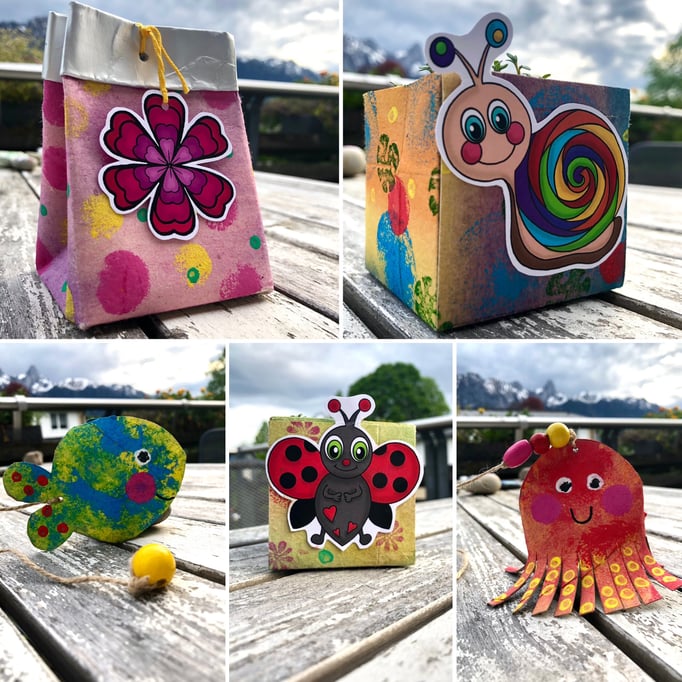 Es wird mit WC-Rollen, Milchtüten, Papier etc. gebastelt. Die Farben sind auf Wasserbasis, sodass auch Flecken auswaschbar sind. Techniken: Stempeln, Kleben, Weben, Tupfen, mit Pinsel,