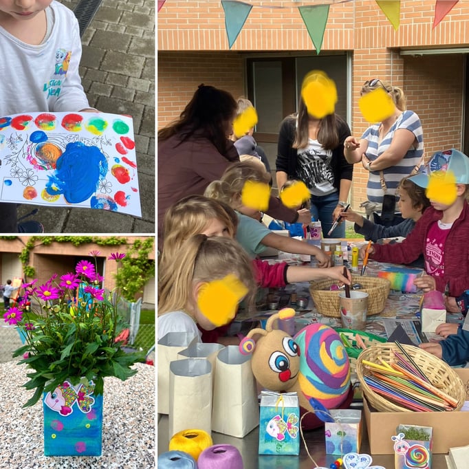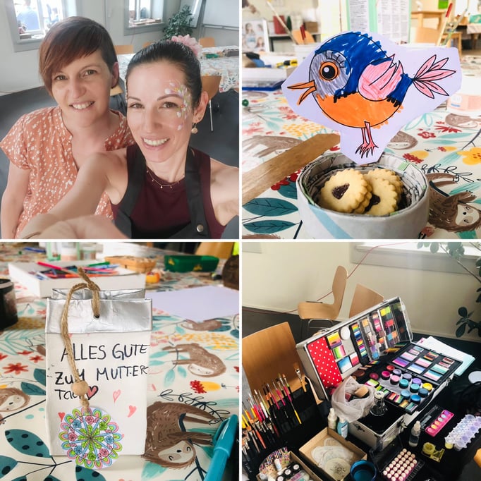 Wir sind gmeinsam vor Ort: Ich bastle mit den Kids + Andrea schminkt die Kinder.