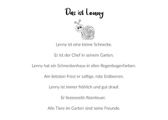 Ich bin Lenny, die kleine Schnecke. Schön, dass ihr meine Geschichte lest und mich und alle meine Freunde kennenlernen