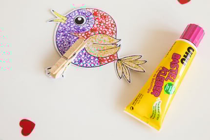 Auf den Vogel die Holzklammer, mit Flüssigleim, kleben. Gut trocknen lassen.