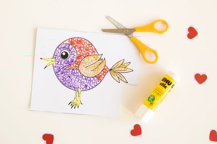 Dann tauche dein Trinkhalm in die Farbe und tupfe damit den Vogel aus. Es entstehen hübsche Kreise.