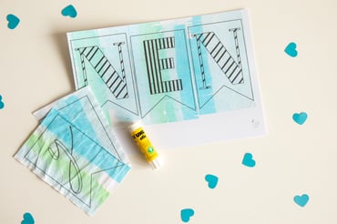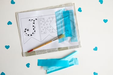Schneide nun das Seidenpapier in Streifen. Mache deine Buchstaben mit dem Pinsel nass und lege die Seidenpapier-Streifen in die nasse Fläche. Gehe allenfalls mit dem nassen Pinsel nochmals