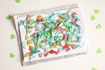 Misch alles durch - danach kannst du alles mit der Hand rausnehmen und auf eine Zeitung legen > die Schnipsel sollten weiterhin mit dem Seidenpapier bedeckt sein. Dann lässt du alles trocknen. Danach nimmst die Seidenpapier-Schnipsel weg. Juhui, es ist schön bunt.