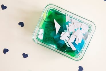 Fülle eine Schüssel mit Wasser. Nimm nun die Reste-Papierschnipsel, mit Leim, vom Block. Schneide kreuz und quer Papierschnipsel. Gib diese ins Wasser und ausserdem noch Schnipsel vom Seidenpapier. Mehrere Farben sind besonders schön.