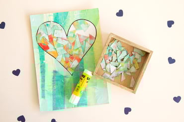 Nimm nun die farbigen Papierschnipsel hinzu und klebe das Herz aus. Dabei kannst du auch mehrere Schichten kleben und deiner Fantasie freien Lauf lassen. Einige kannst du leicht mit der Schere noch "runden" damit es gut passt.